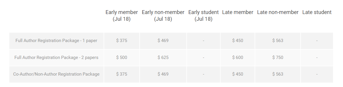 – “Full Author Registration Package – 1 paper” covers the submission of 1 paper to conference proceedings